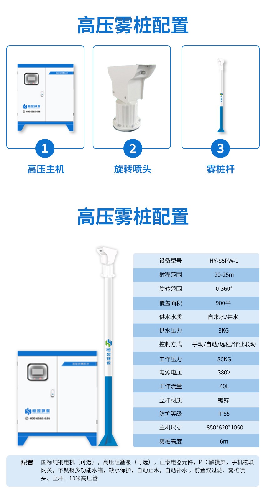 配置 | 国标纯铜电机(可选),高压阻塞泵(可选),正泰电器元件,PLC触摸屏,手机物联网关,不锈钢多功能水箱,缺水保护,自动止水,自动补水 ,前置双过滤、雾桩喷头、立杆、10米高压管 | ||