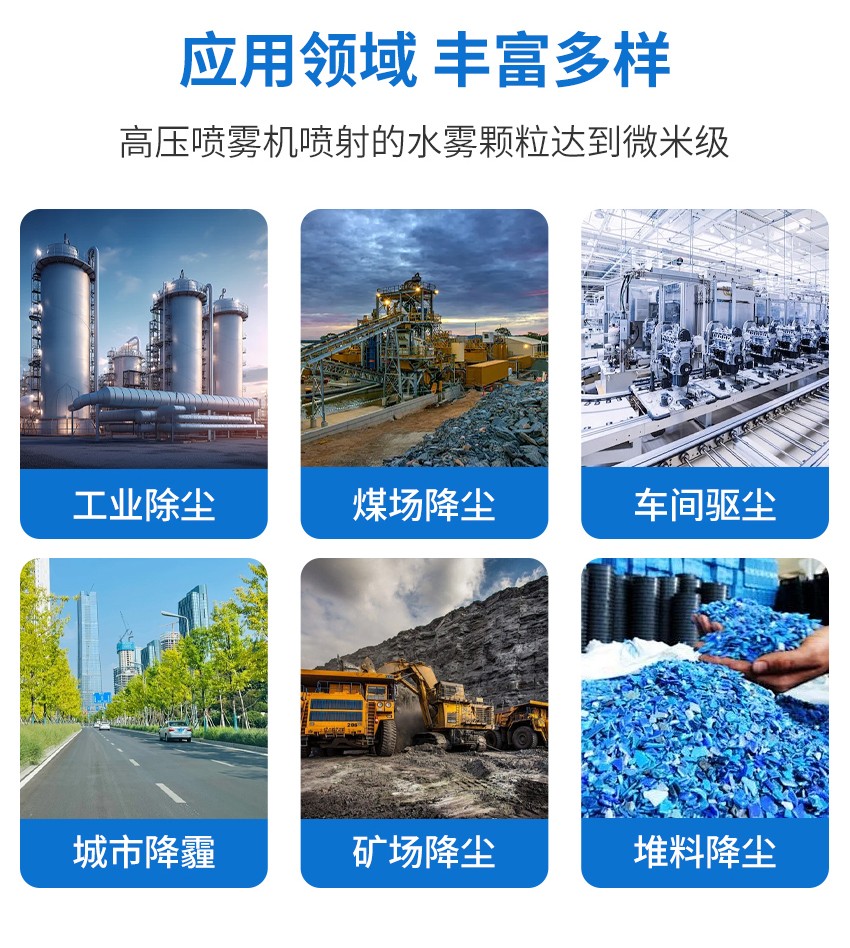 适用行业:水泥厂、无尘车间、钢铁厂、碎石厂、建材厂、木材加工行业、搅拌站、供料车间、纺织车间、电子车间、印刷车间、建筑工地、室外降尘、室外降温等高温扬尘场所