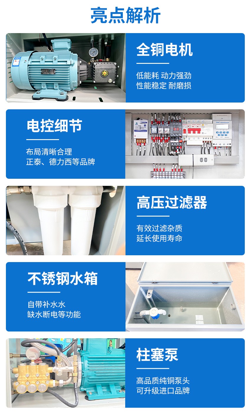 1.采用工业级一体化高压柱塞泵,雾化效果佳、用水量少,节约水资源