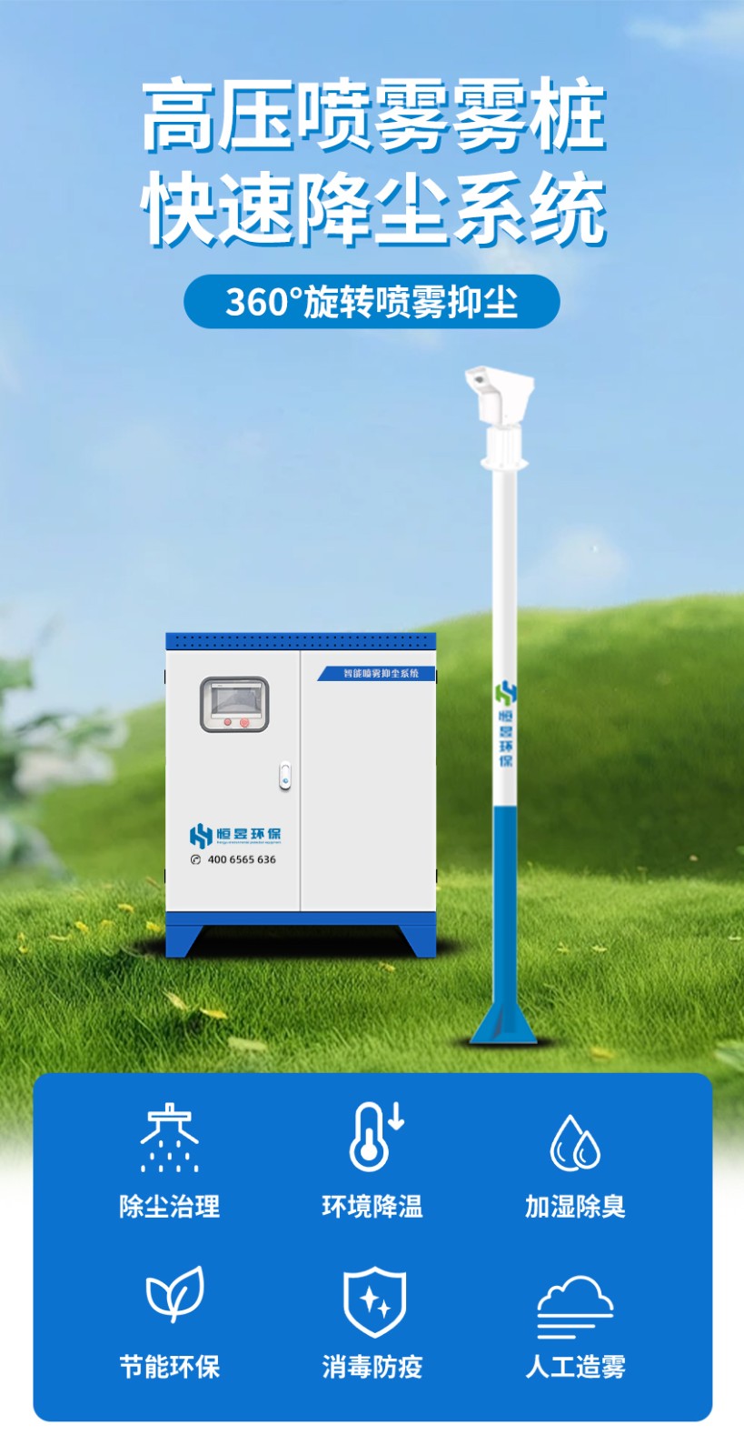 山东恒昱环保设备有限公司生产的雾桩喷雾设备主要针对室外扬尘问题,采用高压喷雾水流技术,通过主机将水加压到高压喷嘴进行雾化和喷射,单个雾桩覆盖面积约5000平,雾桩产生的小颗粒水雾,既可以保证水滴在室外环境不至于快速蒸发,有效地进行抑尘降尘,又不会造成抑尘区域积水。