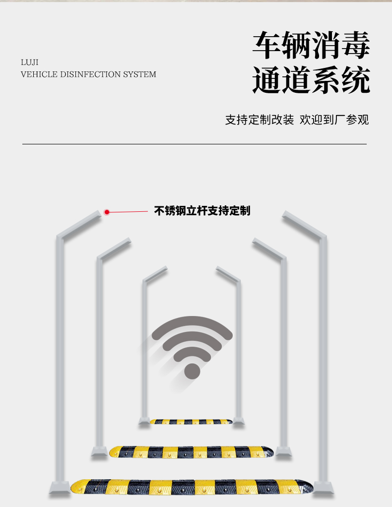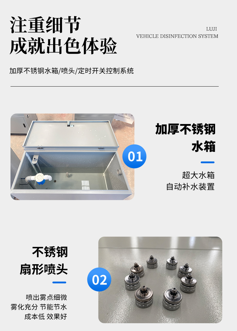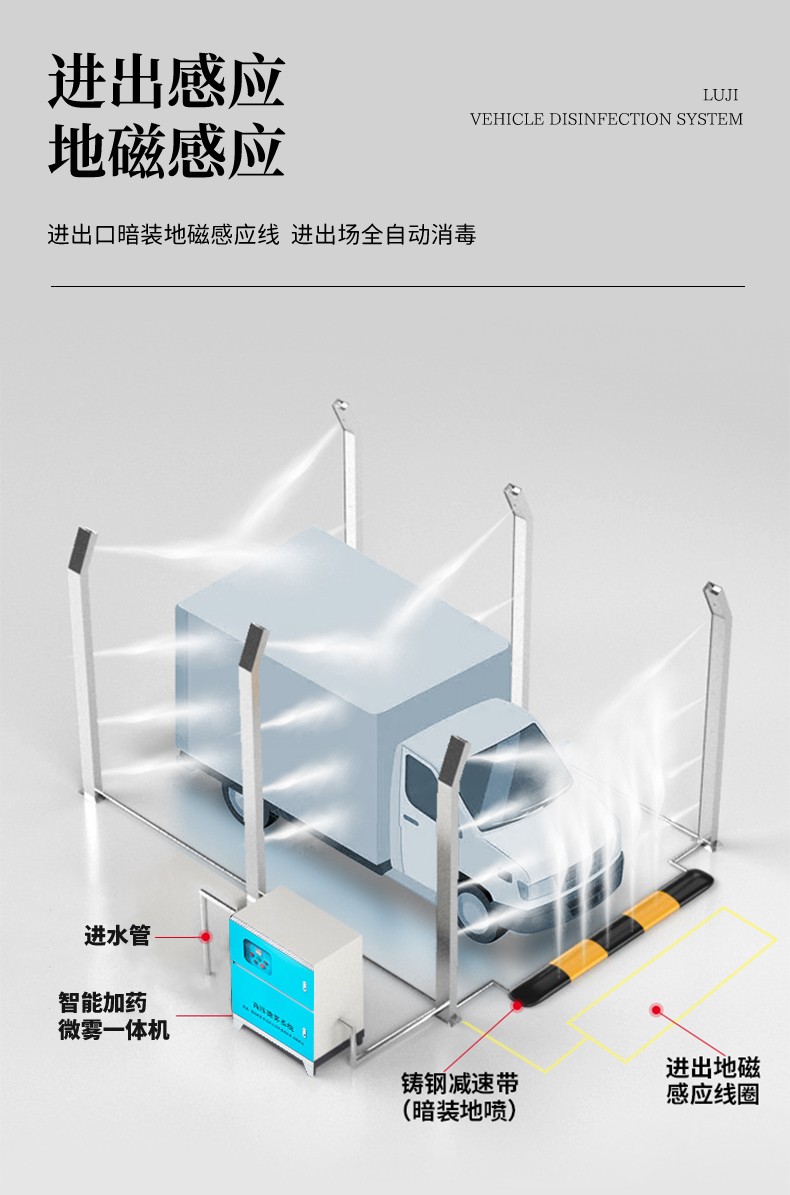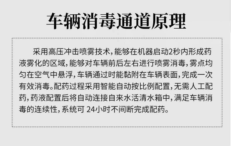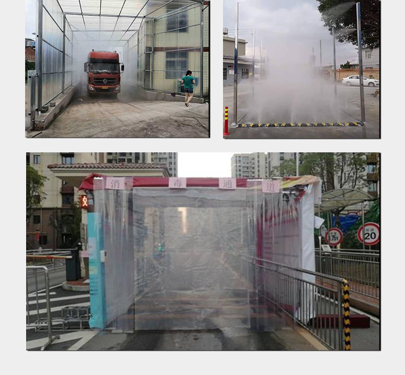 全自动消毒通道采用高压喷雾技术,雾化形成20-150UM的雾化颗粒,雾化均匀弥漫性强,快速全面立体包裹车体,消毒无死角